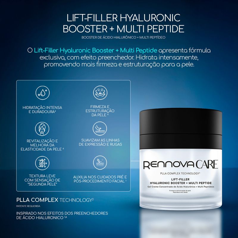 Lift-Filler Hyaluronic Booster + Multi PeptideGel-creme firmador com tecnologia avançada para cuidados diários da pele. O Lift-Filler Multi Peptide + Hyaluronic Booster combina 7 tipos de ácido hialurônico e 3 peptídeos da tecnologia PLLA Complex, promovendo hidratação duradoura, firmeza e suavização de rugas. Com textura leve e toque confortável, auxilia na revitalização da pele, melhora da elasticidade e sensação de segunda pele.